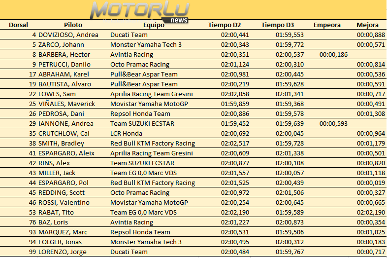 Las mejoras y los que se han dejado tiempo, ordenados de mayor a menor. Hoy quien ha destacado ha sido Dani Pedrosa, un modelo de trabajo que no busca inicialmente un buen registro, sino consumar y consolidar cada avance en la configuración. También Smith, con una metodología similar, ha guardado todos los avances para el último día, de la misma manera encontramos a Márquez y destacable la mejora continuada de Alex Rins.