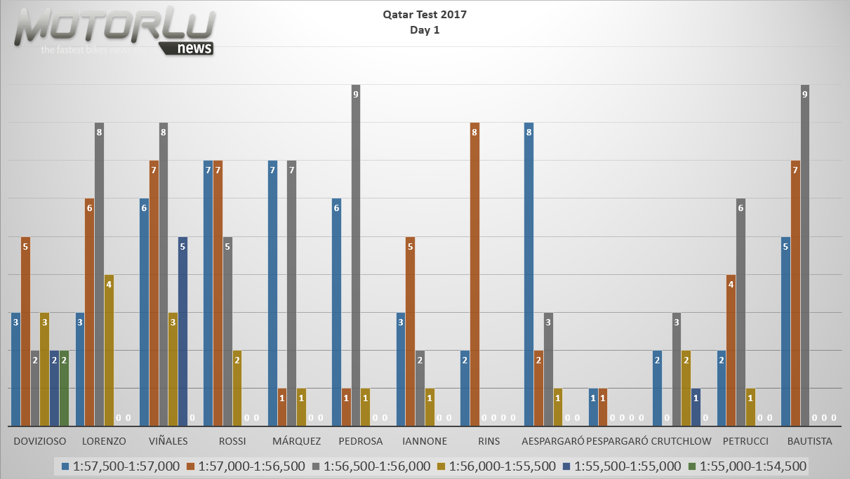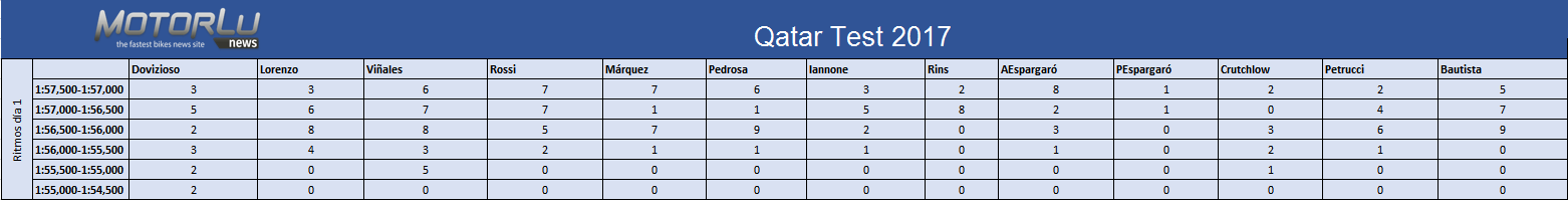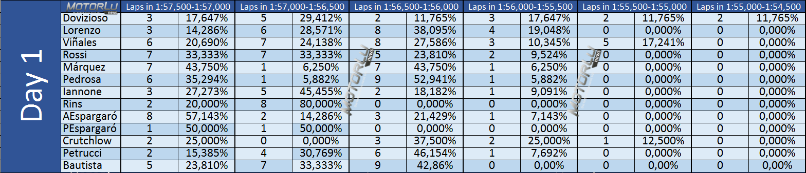 Destaca Lorenzo, que lleva su carga de mayor número de vueltas a los tiempos por debajo del 1,56,5, al igual de Dani Pedrosa o Danilo Petrucci. En el tiempo que parece ser la frontera para la mayoría de pilotos, por debajo de 1:56, es favorable a Crutchlow, Lorenzo y Dovizioso, mientras que por debajo sólo Dovizioso y Viñales se significan.