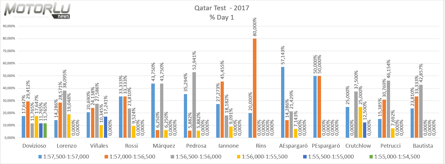 Sin ser exacto, cuando vemos el porcentaje de las vueltas dadas en un tiempo concreto, podemos adivinar si para cada piloto es cómodo o no conseguir unos cronos determinados. Si es cómodo, puede indicar un posible ritmo de carrera, pero dadas las especiales características del circuito de Losail este primer día es extremadamente complejo de valorar.