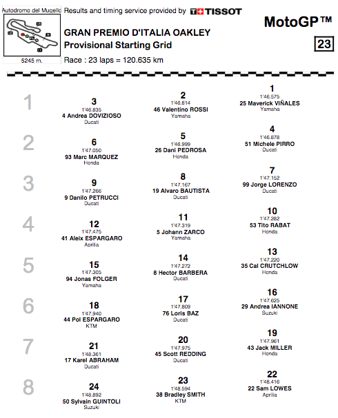 La segunda línea comienza con Michelle Pirro desde la cuarta plaza, Dani Pedrosa desde la quinta y Marc Márquez desde la sexta. Jorge Lorenzo ha cedido poco más de tres décimas respecto a su compañero de equipo y saldrá séptimo, seguido de Álvaro Bautista que lo hará octavo y Danilo Petrucci que lo hará noveno.