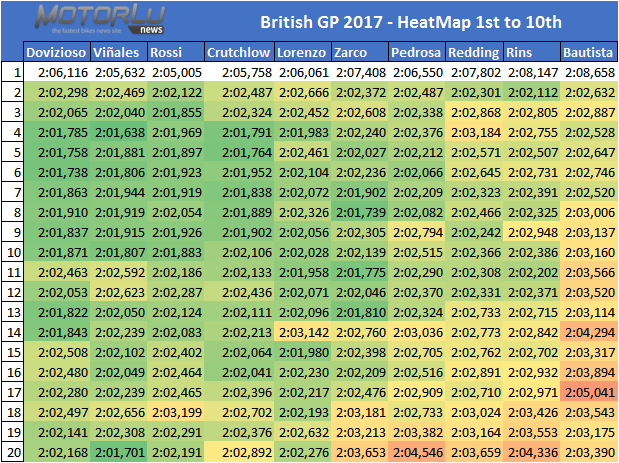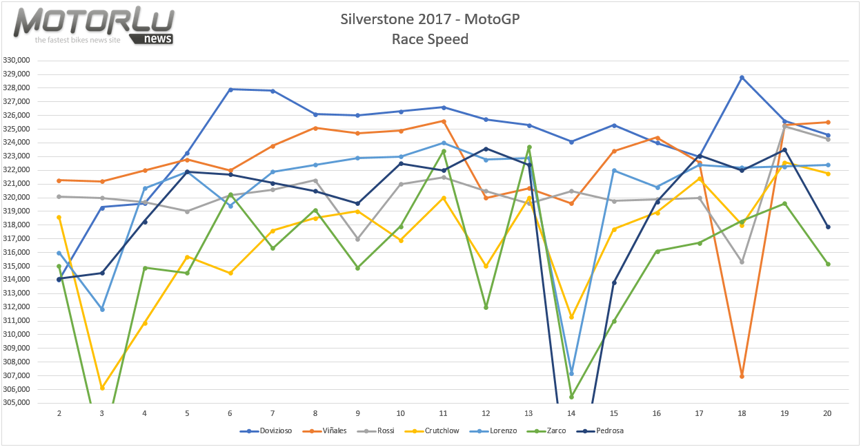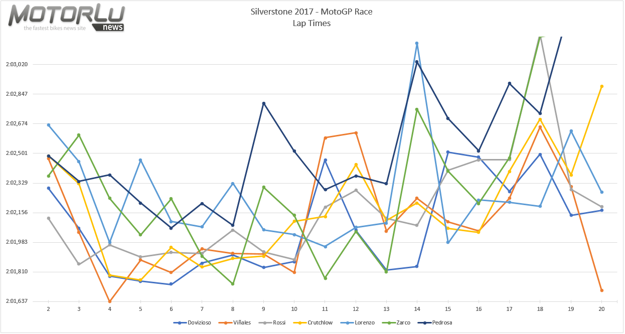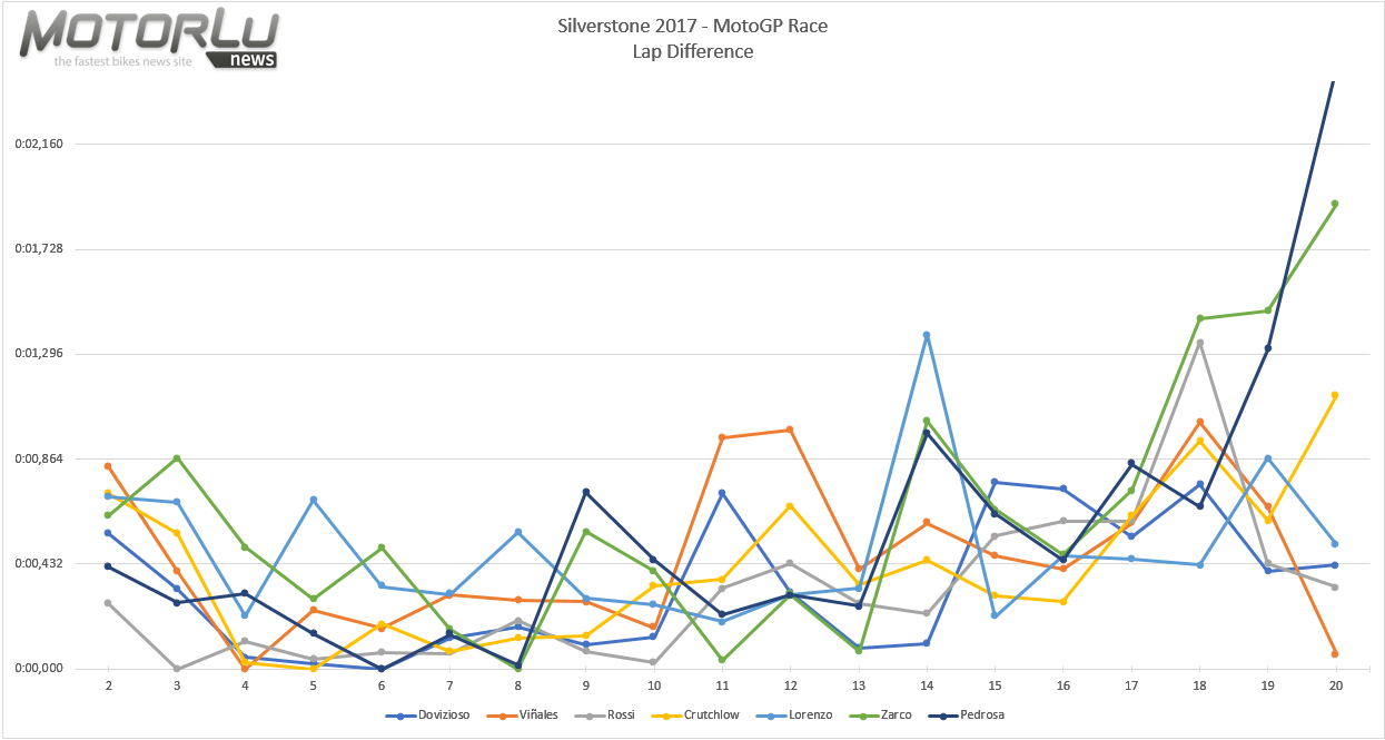 Quitando a Zarco y Pedrosa al final de la carrera, dado que al no poder ganar ni perder plaza se dejaron ir de la misma manera que lo hizo Crutchlow, esta es una de las carreras en qué más parejos han sido los registros de los 7 primeros pilotos, y todos ellos se mueven en unas diferencias de poco más de 4 décimas a lo largo de los 20 pasos por meta. Las pocas diferencias entre ellos han obligado a tener una carrera de alta intensidad durante todos los giros.