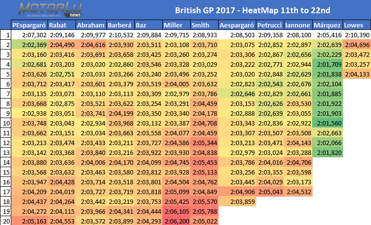 Esta tabla se debe leer en vertical, dado que el mapa de calor está aplicado por cada sector. El color verde más intenso es el mejor tiempo, y se llega al rojo más intenso que señala al peor tiempo, pasando desde la degradación del verde, al amarillo y finalmente el mencionado rojo.