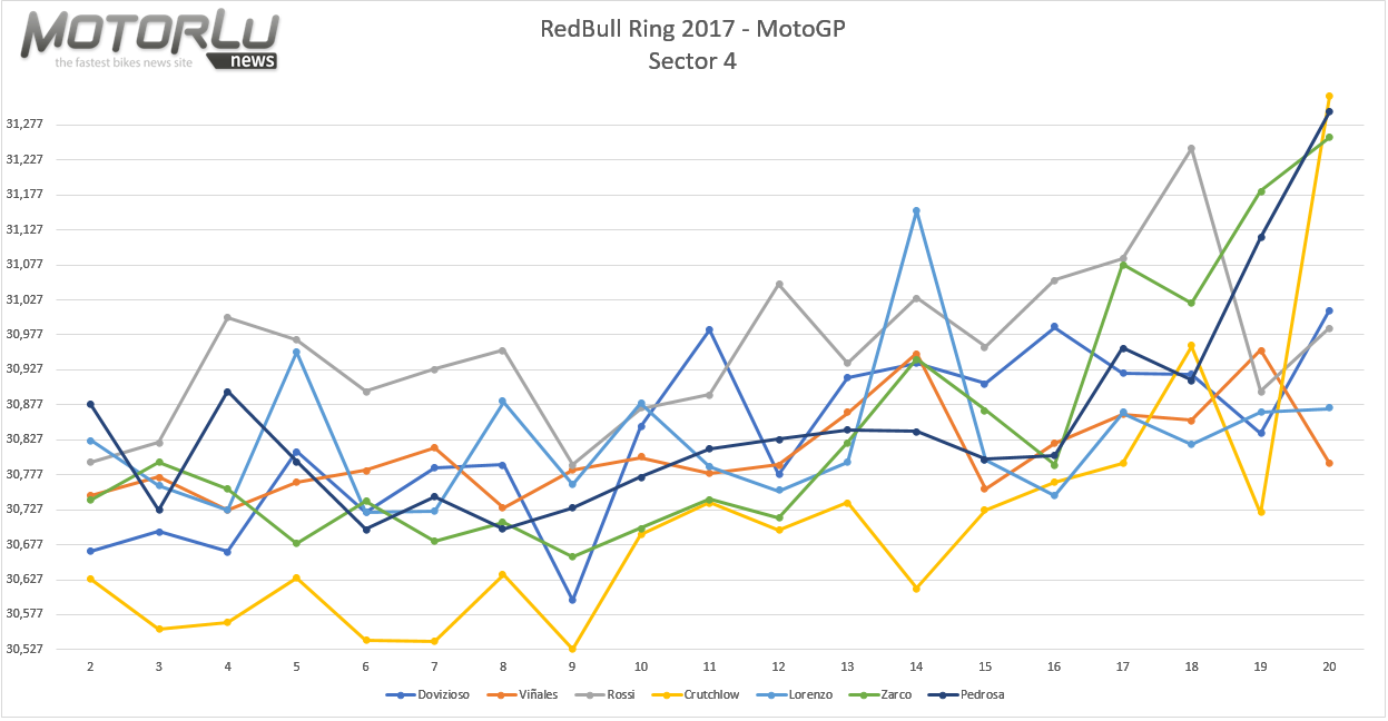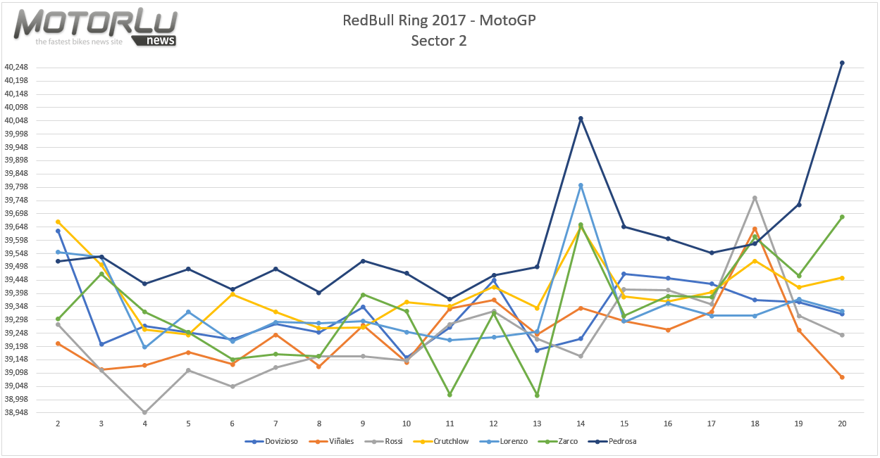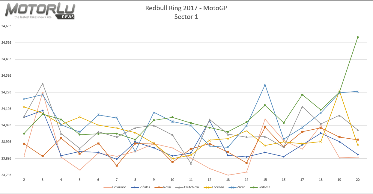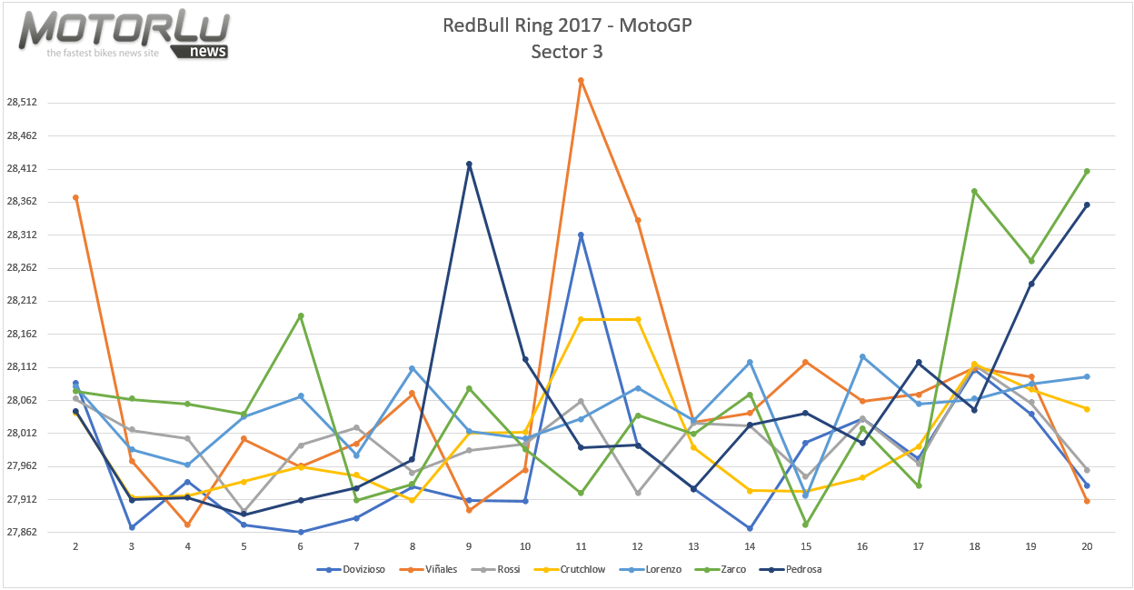 A pesar de la dificultad de encontrar diferencias, el primer sector fue favorable a Dovizioso durante el primer tercio de la carrera, mientras en el último lo fue para Viñales. Por el contrario eran Zarco y Pedrosa quienes tenían mayor dificultad para pasar el sector en buenos tiempos.