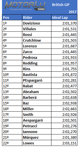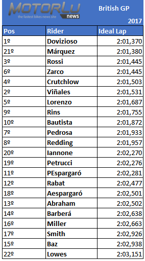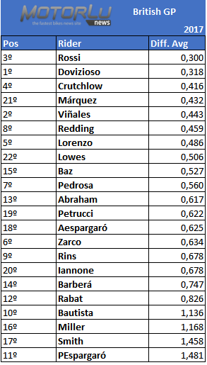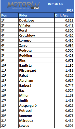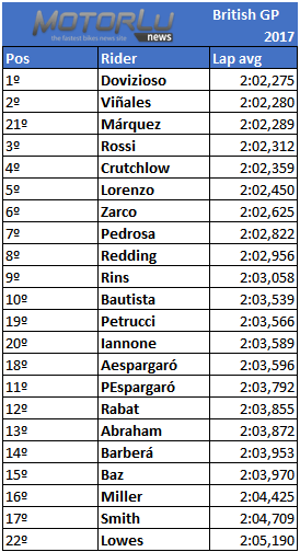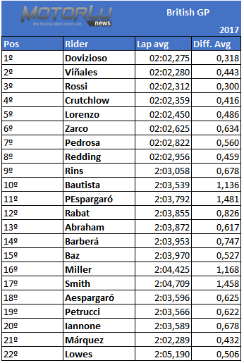 A pesar de que no terminaron, se ha incluido a todos los pilotos, de ahí que veamos a Márquez como el 3r hombre con mejor promedio, o a Aleix en 18ª posición.