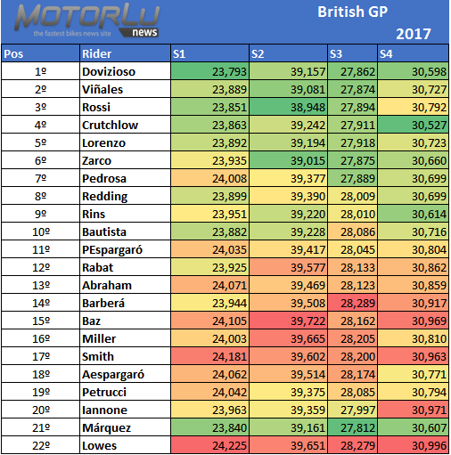 Como es lógico los pilotos de la parte alta de la tabla tienen sus sectores con mayor predominio de los verdes, a excepción de Márquez, que al no haber terminado está al fondo de la tabla.