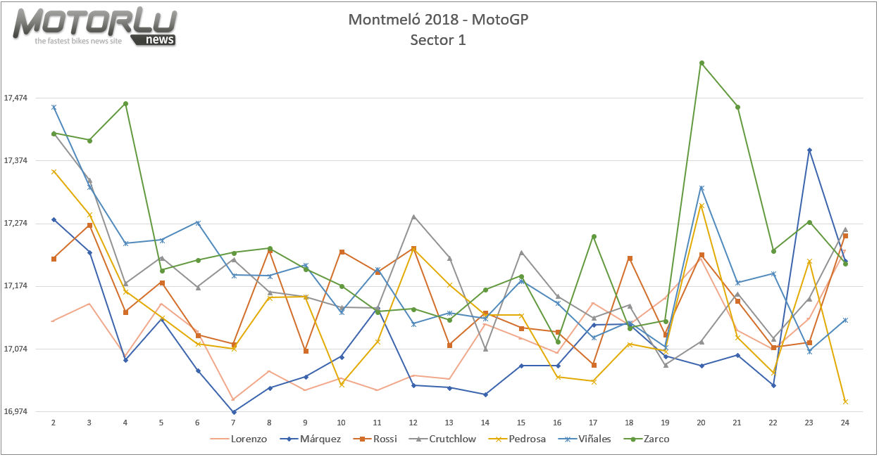 Podemos ver que en el primer sector hay tres pilotos que están por debajo de los 17 segundos, pero no con una gran diferencia sobre los demás competidores. Lorenzo, Márquez y Pedrosa tienen un 16,9 y Bautista, que es 9º en la carrera, un 17,0.