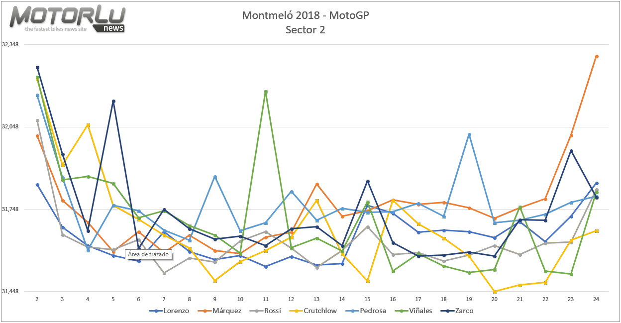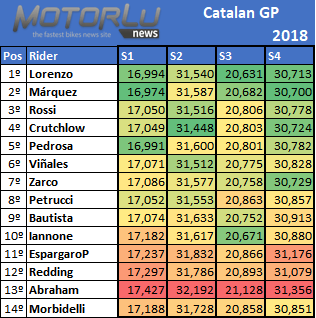 El segundo sector es más favorable a Cal Crutchlow, meitendo casi una décima a Viñales y Rossi, que son sus dos mejores rivales en esa sección de la pista. Mientras que el sector vuelve a ser para Lorenzo y Márquez, con la aparición estelar de Iannone, y el cuarto no ofrece demasiadas distancias entre los pilotos.