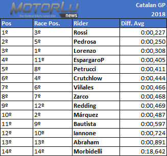 Vemos que Márquez, que terminó segundo, aparece 10º de este cálculo, esto es debido a sus 4 últimas vueltas. Especialmente la penúltima fue una losa para este promedio, llegando a los casi 2 segundos de distancia de su propio mejor tiempo, que marcó en la vuelta 8.