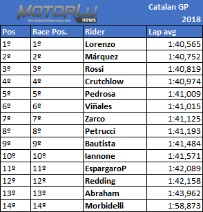 Viñales registra sus vueltas en verde, como representación de buenos tiempos, a final de carrera, en la última parte, mientras que Crutchlow tuvo 2 partes de buen ritmo. En tanto que Dani Pedrosa apenas lleva sus tiempos hacia el verde y pasa todas las vueltas de la carrera en el templado del color amarillo, es por eso que en el anterior apartado de vueltas ideales Dani pierde posición con Zarco.