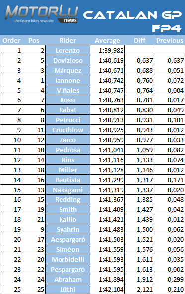 Si hiciésemos una carrera con los ritmos medios que se obtienen de las vueltas que se ajustan al estudio, los datos que se han presentado anteriormente, con lo que queda muy claro que puede haber un auténtico ‘jefe’ para la carrera de mañana en Jorge Lorenzo.