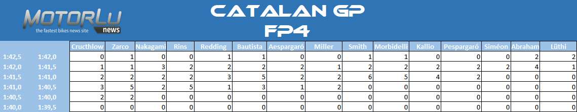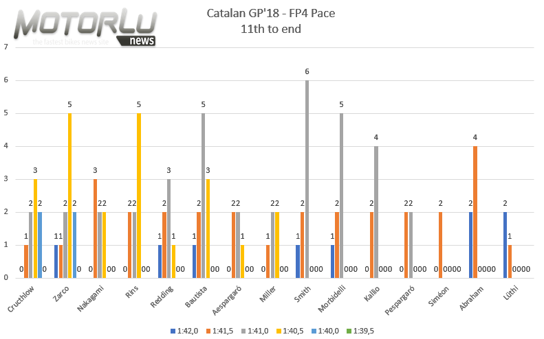 Podemos apreciarlo en las columnas de vueltas acumuladas en cada uno de los ritmos, en que Rins presenta un ritmo muy constante en el 1:40 alto, frente a algunas vueltas del de Honda y del de Yamaha. Por su parte, Aleix Espargaró, si no encuentra algo en el warm-up del domingo por la mañana, no podrá optar a mejorar su clasificación.