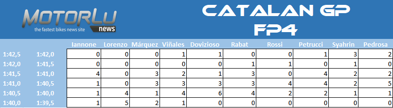 La siguiente tabla permite una comparación de qué piloto ha dado más vueltas en un segmento determinado. Podemos ver, en un primer golpe de vista, que Jorge Lorenzo es quien mejor ritmo tiene.