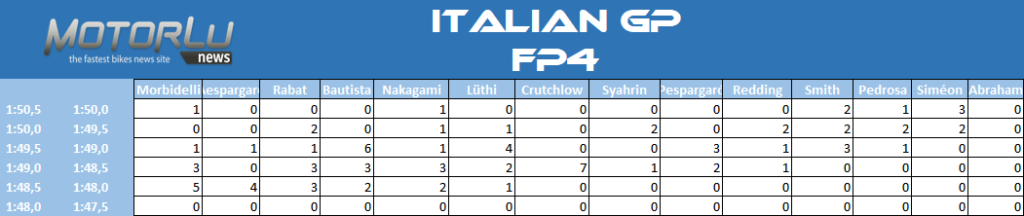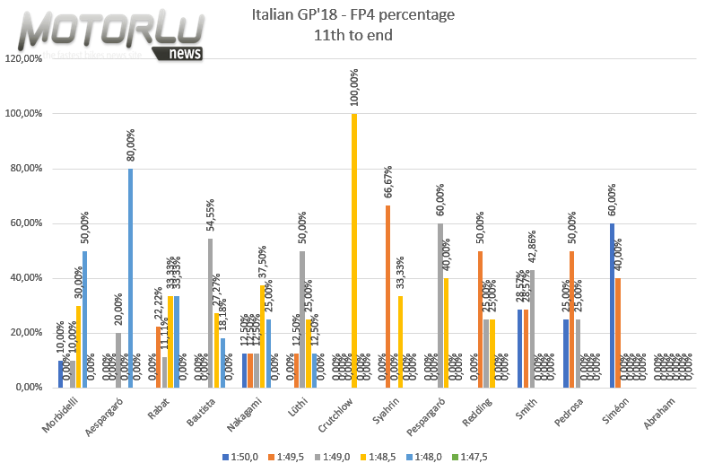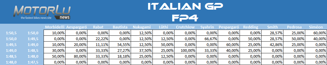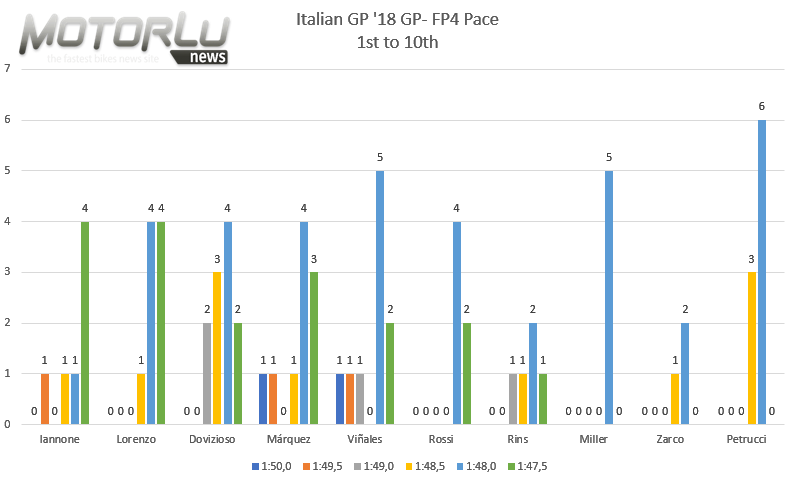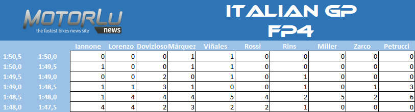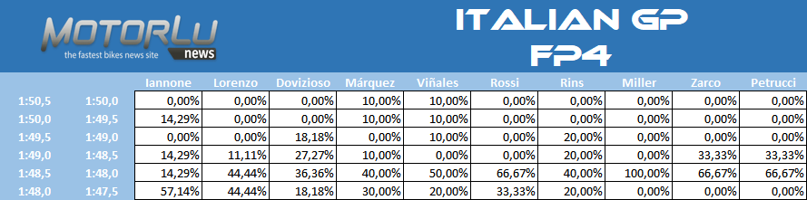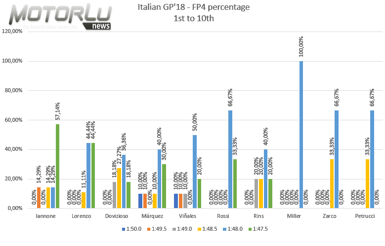Para Andrea Iannone es relativamente sencillo conseguir tiempos en el segmento más rápido, casi un 60%. Pero sumando los 2 mejores parciales estudiados, los tiempos en que se espera que se desarrolle la carrera, suma un 75% contra el casi 90% de las vueltas que Jorge Lorenzo puede dar en esas dos horquillas de tiempo.