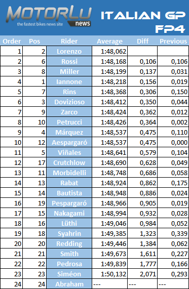 Si hiciésemos una carrera con los ritmos medios que se obtienen de las vueltas que se ajustan al estudio, los datos que se han presentado anteriormente, tendríamos que existiría una cerrada lucha entre los cuatro primeros, ya que la diferencia entre Rossi y Miller es casi inexistente, y menor aún de Jack a Andrea Iannone.