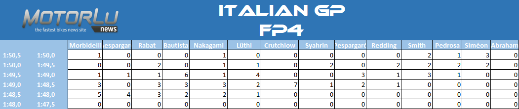 La siguiente tabla permite una comparación de qué piloto ha dado más vueltas en un segmento determinado. Podemos ver, en un primer golpe de vista, que Jorge Lorenzo es quien mejor ritmo tiene.