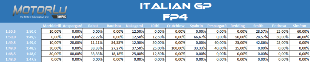 Dovi sumaría algo más del 50% y Márquez un 70%, lo mismo que Viñales. Pero atención, que todos se verían superados por Rossi, que está a punto para rodar toda la carrera en esos tiempos, ya que él consigue el 100% de sus tiempos en el ritmo de carrera. Ojo con el italiano en su circuito talismán.