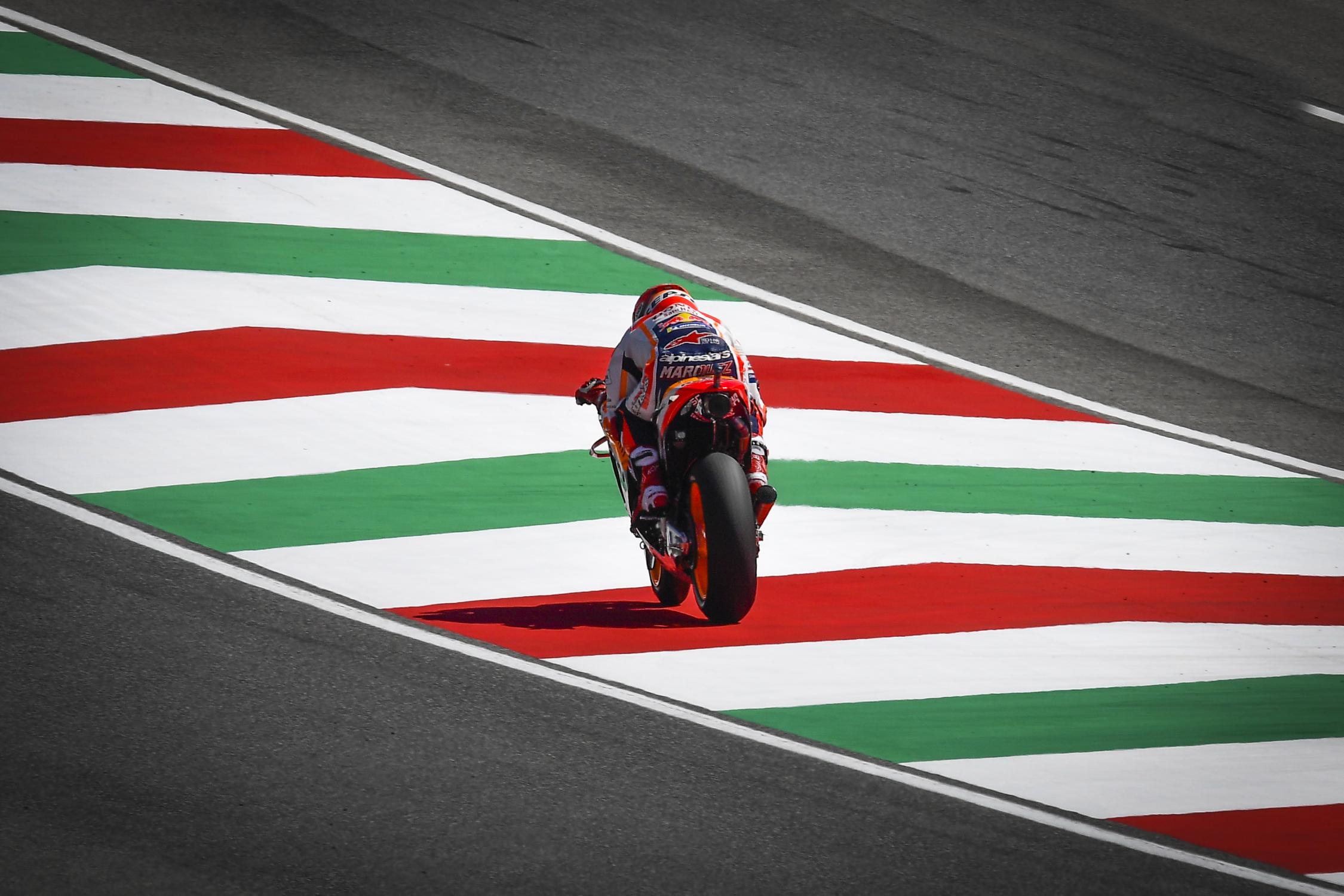 Y cuando se apagó el semáforo a las 14:00 CEST (hora local en los valles de La Toscana) Marc Márquez salió desde el lado izquierdo de la segunda fila de la parrilla como un ciervo herido, llegando pasadísimo a San Donato y metiéndole un hachazo marca de la casa a Danilo Petrucci en la curva tres. Sobre este lance, información: Dirección de Carrera barajaba una sanción de varios segundos cuando llegara la bandera de cuadros, hasta que fue el propio Márquez el que decidió ponerse la peor multa posible él mismo; y no fue necesario ocuparse del caso, ni escuchar reclamaciones posteriores. Todo esto, según el criterio de los árbitros de la cosa.
