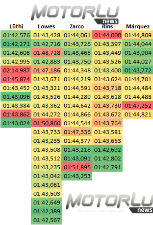 Aquí se puede observar cuáles han sido los ritmos que ha tenido cada uno, y en qué momento de la sesión ha marcado su mejor ritmo. En este sentido hay que volver a destacar a Sam Lowes, que ha sido el que ha hecho las tandas más largas y acercándose a lo que sería el ritmo de carrera.