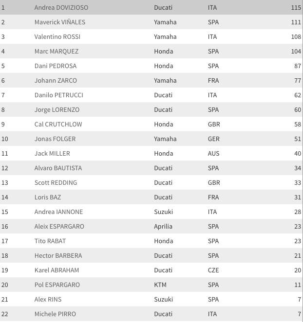 Sin embargo Cal Crutchlow todavía tenía cosas que decir. El británico ha reducido distancias hasta engancharse a Márquez y Dovi cuando ya solo quedaban dos vueltas para terminar. El podio tenía un nuevo candidato y el toma y daca ha sido constante entre los tres. Por delante Petrucci ha intentado el asalto para conseguir la victoria, pero al doblar a Álex Rins se ha visto bloqueado y eso le ha dado unos metros vitales al italiano. Por detrás Márquez dejaba ir los frenos para adelantar a Crutchlow y asegurarse la tercera posición, lo que ha dejado al británico en cuarta posición y Dovizioso en la quinta. Esta quinta plaza para el italiano le vale encabezar la general en un día en que Maverick Viñales, que llegaba líder del campeonato, ha sumado cero puntos.