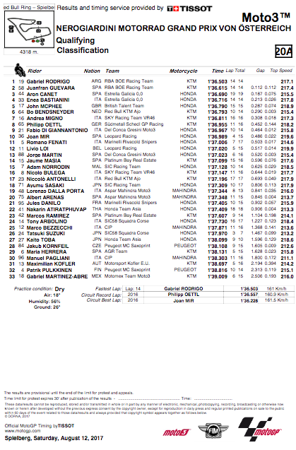 Gabri Rodrigo arrancará primero en el Gran Premio de Austria como ya hizo una semana antes en Brno, después de una sesión de clasificación en la que ha sido el más rápido con un crono de 1’36.506. El RBA BOE Racing Team ha firmado un clasificatorio perfecto con la segunda posición de Juanfran Guevara a poco más de una décima de su compañero, después de que Joan Mir haya perdido la segunda plaza por haber excedido los límites de la pista en la vuelta que le había dado la segunda posición. El conjunto español ha dado así la pole y la segunda posición a KTM en su Gran Premio de casa, precisamente en una temporada en la que Honda ha sobrepasado a la marca austriaca durante la primera parte de la temporada.