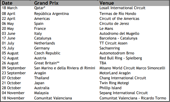 El calendario de MotoGP para 2018, en su primera versión tentativa, se parece bastante al que se ha seguido para el campeonato del presente año aunque ha habido que hacer cambios para incorporar el nuevo gran premio indonesio.