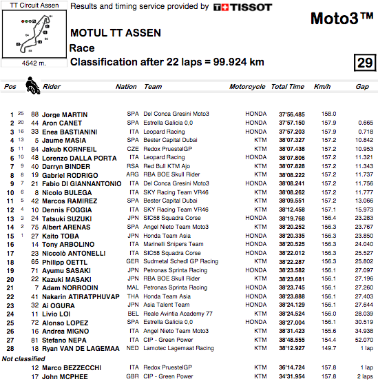 Así Martín ha conseguido más de medio segundo de ventaja para la última vuelta. Canet apretaba los dientes por detrás, pero a su vez acechado por Bastianini. El golpe de efecto ha llegado cuando Marco Bezzechi se ha ido al suelo en la última vuelta, lo cual ha dado el liderato de la general a Jorge Martín tras cruzar primero la línea de meta, seguido por Canet que acababa de recuperar la segunda posición respecto a Bastianini. El italiano ha cerrado el podio después de verse adelantado por Canet antes de la chicanne de entrada a meta. Así ha terminado la primera carrera del Gran Premio holandés: