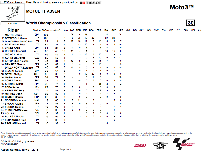 Una carrera muy importante para la clasificación general que le devuelve e liderato a Jorge Martín. Ha estado marcada por el fuerte viento que azotaba el trazado holandés y las pocas caídas que se han producido, especialmente para tratarse de la categoría pequeña, además de las penalizaciones aplicadas por salidas de pista y recortes de trazada. Así queda la clasificación general tras el Gran Premio de los Países Bajos: